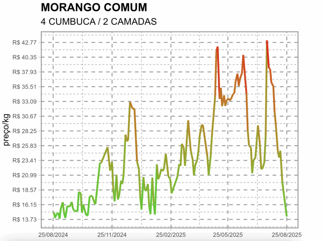 - Em julho, custava R$ 23,70, tendo chegado até R$ 42,77/kg durante o período da febre do “morango do amor”.